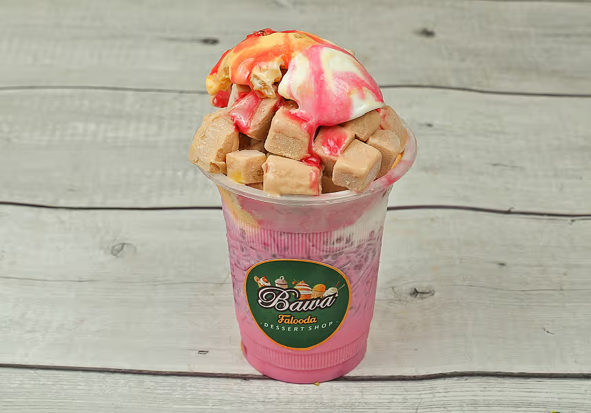 Vanilla & Kaju Kishmish Ice Cream, Malai Kulfi, Milk, Falooda, (Basil) Sabja Seed, Dryfruits & Topped with Rose Syrup